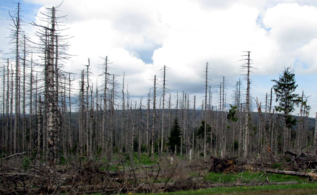 Am Willkommensschild für den Nationalpark Harz scheint die Welt noch in Ordnung. Im Tal fallen abgestorbene Bäume noch nicht so sehr auf. Doch je höher wir kommen, desto gravierender entwickelt es sich. Bei Torfhaus, der mit etwa 800 Metern höchstgelegenen Siedlung in Niedersachsen, die ihren Namen dem Torfabbau verlangt, ist es schlimm.