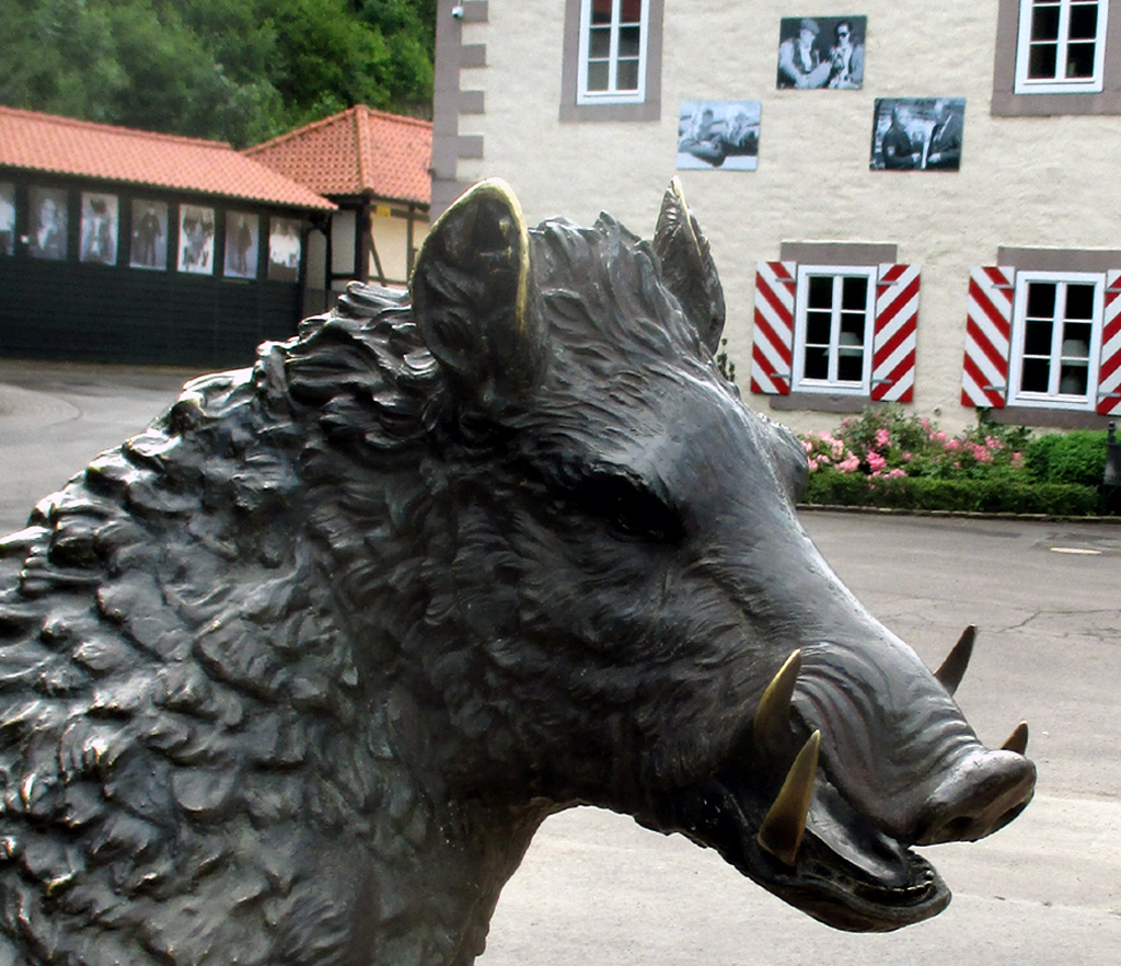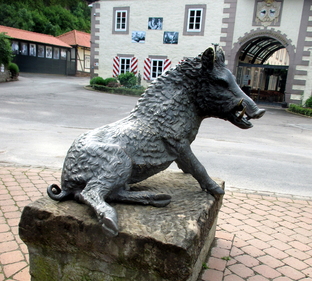 Sitzender Keiler vor der Hardenberg-Kornbrennerei am westlichen Harzausläufer. Fotos: Koch