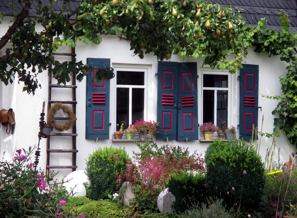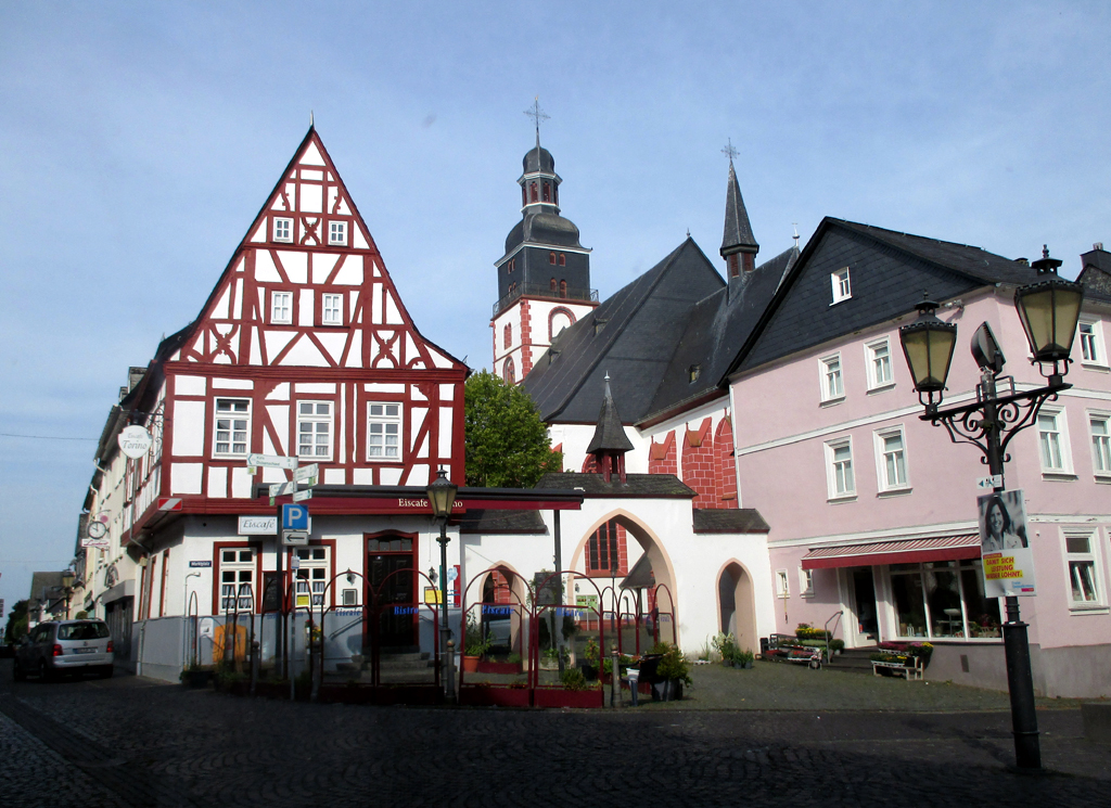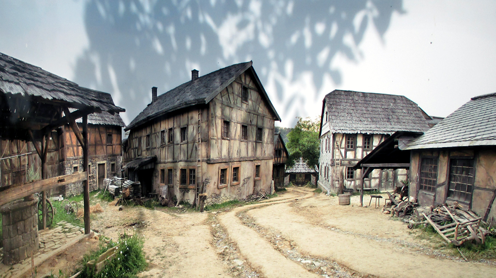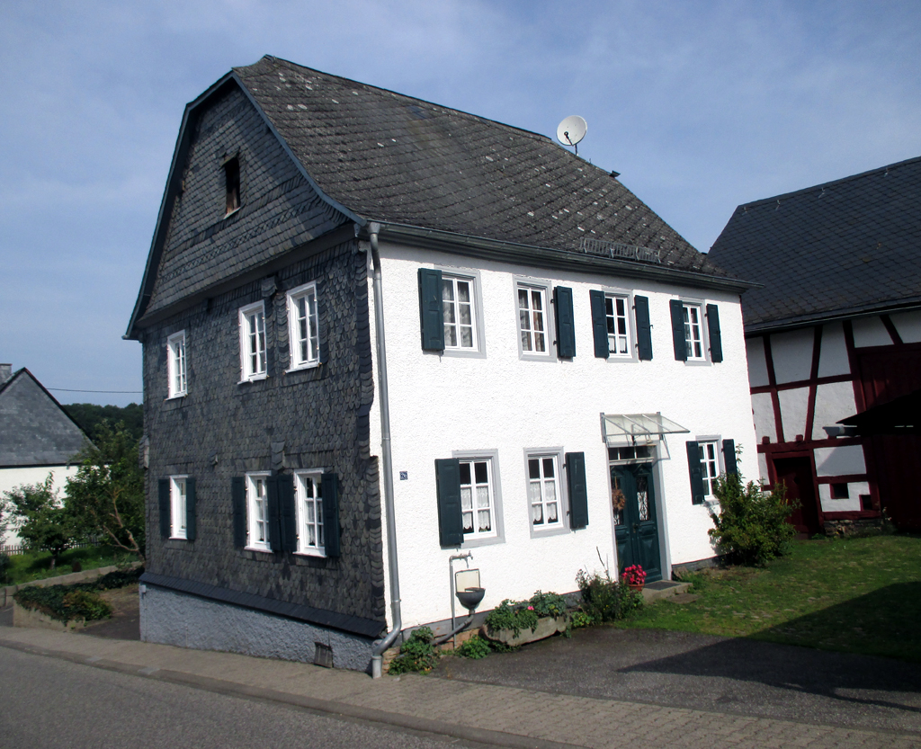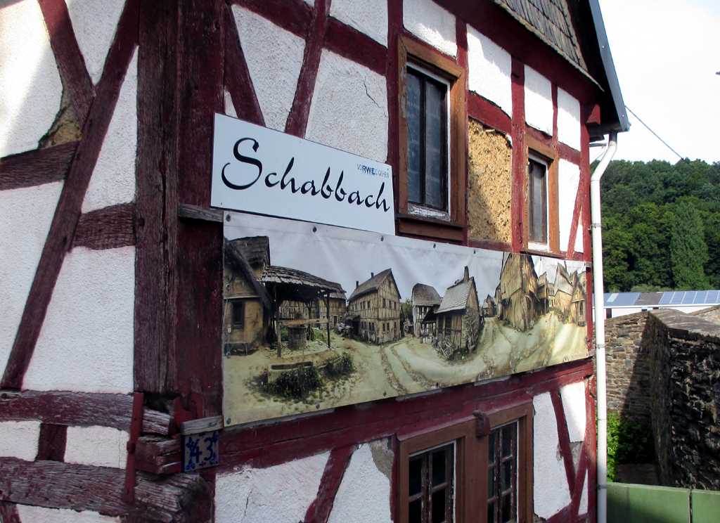 Dann biegen wir ab. Zurück in die Vergangenheit. Erst nach Kirchberg, älteste Stadt im Hunsrück, nachdem der Ort schon 1259 die entsprechenden Rechte dafür verliehen bekommen hat. Weiter nach Gemünden zu Füßen des um 1300 erbauten Schlosses. Schließlich Gehlweiler. Nur 250 Einwohner. Am Westhang des Soonwalds. Unten fließt der Kellenbach am buntbemalten Buswartehäuschen gemächlich dahin. Ins Dorf, das auf den ersten Blick nur aus einer Straße zu bestehen scheint, führt direkt daneben eine schmale Steinbogenbrücke, auf die - gerade so - ein einziges Auto passt. „Willkommen in der Heimat der ‚Heimat‘“, steht auf einem Bild der „Schabbacher Kultur- und Heimatfreunde“, das Mitglieder des Vereins in Hunsrücker Tracht neben einem alten Leiterwagen hinter einem querformatigen Transparent mit Aufnahmen alter Gebäude in Gehlweiler zeigt. An der ansteigenden Hauptstraße 26 des Orts, der für einige Zeit für „Heimat“ mit aufwendigen Kulissen zumindest vorübergehend wieder ins 19. Jahrhundert zurückversetzt worden ist, halten wir an.
