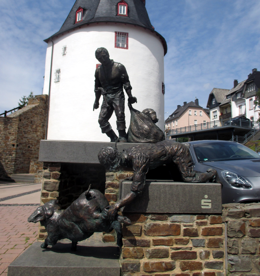 In Simmern, mit dem Auto von Morbach nordöstlich eine gute halbe Stunde oder knapp 40 Kilometer entfernt, geht es an diesem Freitag am Nachmittag trotz Sonne und blauem Himmel überaus beschaulich zu. Kaum Touristen, die das Schloss oder den Schinderhannes-Turm fotografieren, das einstige Pulvermagazin mit Gefängnisraum, in dem 1799 auch Johannes Bückler, genannt Schinderhannes, gefangen gewesen ist (aber wenig später schon wieder fliehen konnte). Auf dem Platz davor erinnert eine Skulptur an einen Schweinediebstahl des Räuberhauptmanns, den dieser samt Kumpan begangen hat.