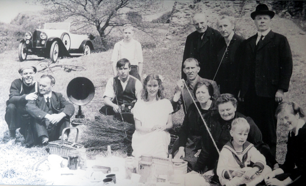 Die Simons beim Picknick an der Burgruine Baldenau mit dem Erzähler, Dorforiginal Glasisch, ganz links. Fotos: Koch