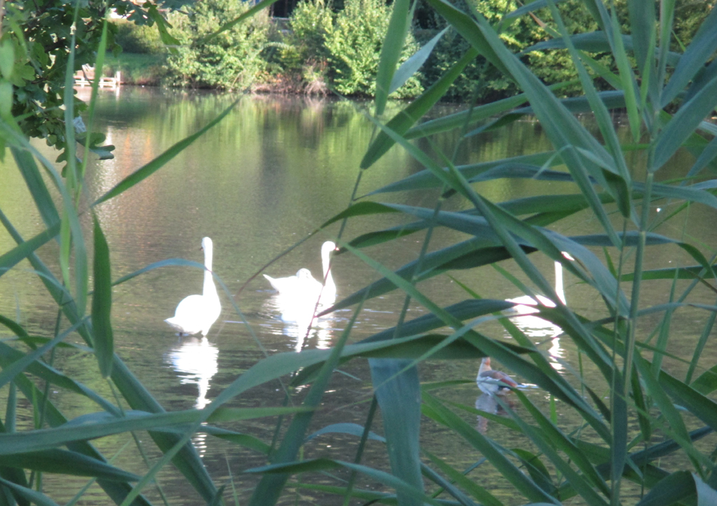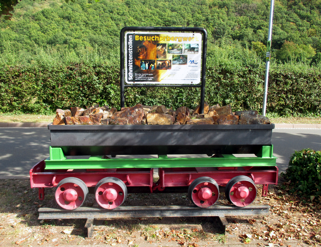Die Lore weist auf den Schmittenstollen hin. Schwanensee auf dem Stausee Niederhausen.