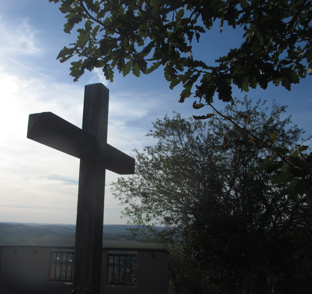 Vom Rotenfels reicht der Blick bis zur Ebernburg. Kreuz auf dem Steilwand-Plateau.