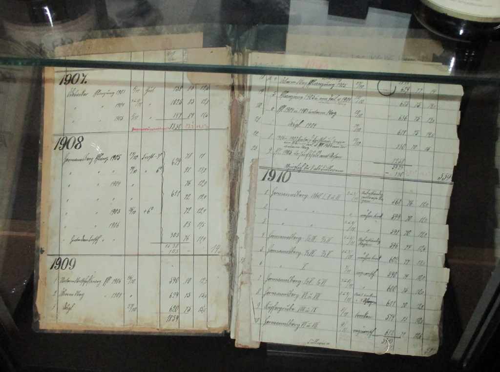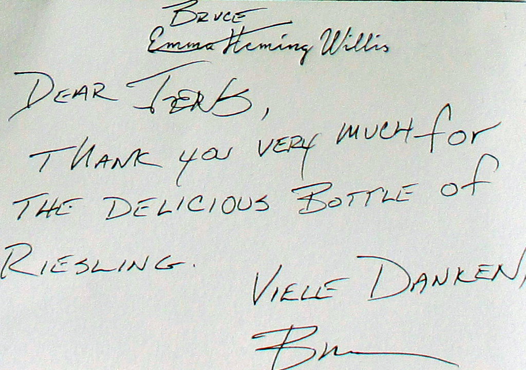 Wir schauen uns in einem Historienraum mit gläsernen Vitrinenschränken und Schaukästen um, die wichtige Dokumente unterschiedlichster Art aus früheren Tagen enthalten, von alten Büchern mit Zahlen aus den 1900er-Anfangsjahren der Domäne bis hin etwa zum Gästebucheintrag 1984 reichen, der an die Übergabe einer Schatzkammer-Kostbarkeit, einer 1916er-Schloßböckelheimer-Kupfergrube-Riesling-Auslese, an François Mitterand erinnert; außer Frankreichs Staatspräsident wirken auf dem beigefügten Foto auch noch Bundeskanzler Helmut Kohl und Bernhard Vogel, ehemaliger Ministerpräsident von Rheinland-Pfalz, ziemlich gut gelaunt. Gleich daneben eine Aufnahme aus dem Jahr 1981, die mit Erläuterung den britischen Thronfolger Prinz Charles und Lady Diana nach kirchlicher Trauung zeigt: „Bei der Hochzeitsfeier wird eine 1959er-Kupfergrube-Riesling-Trockenbeeren-Auslese gereicht.“ Unterhalb davon bedankt sich Bruce Willis schließlich handschriftlich für eine „delicious bottle of Riesling“ („köstliche Flasche Riesling“). Der US-Schauspieler, der ein 2013er-Bastei-G(roßes)G(ewächs) vom Gut Hermannsberg genossen hat, ist 1955 nicht weit von Niederhausen als Sohn eines amerikanischen Soldaten und einer Deutschen geboren. In Idar-Oberstein.