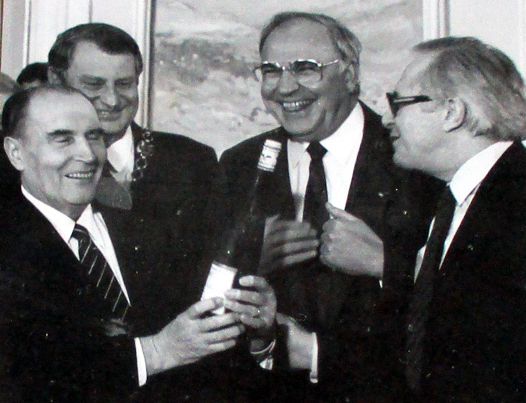 Buchdokument aus den Anfängen. Gutsgäste (von rechts) Bernhard Vogel, Helmut Kohl, François Mitterand.