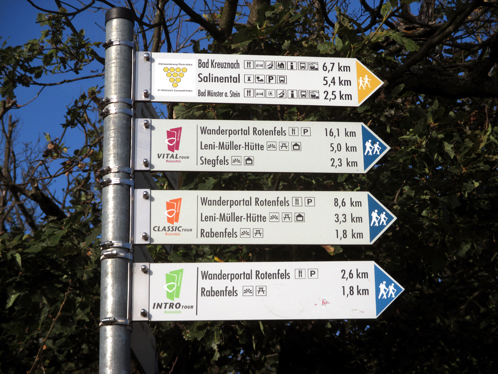 Auf dem Rückweg wandern wir über den auf dem Gebiet von Traisen liegenden, von der Nahe geschaffenen Rotenfels, dessen 202 Meter hohe und 1200 Meter lange Fels- als „größte Steilwand zwischen Alpen und Skandinavien“ gelten soll und auch erfahrenen Kletterern ein anspruchsvolles Revier bietet. Die auffallend rötliche Südwestwand hat übrigens dem insgesamt fast 330 Meter hoch aufragenden Berg ihren Namen gegeben. Zu dessen Füßen, wo Landesstraße und Bahn nahezu parallel durchs Tal der Nahe verlaufen, erstrecken sich die Weinlagen Traiser Bastei und Traiser Rotenfels. Das Bergmassiv ist zugleich Naturschutzgebiet, unter anderem wegen der Greifvögel dort.