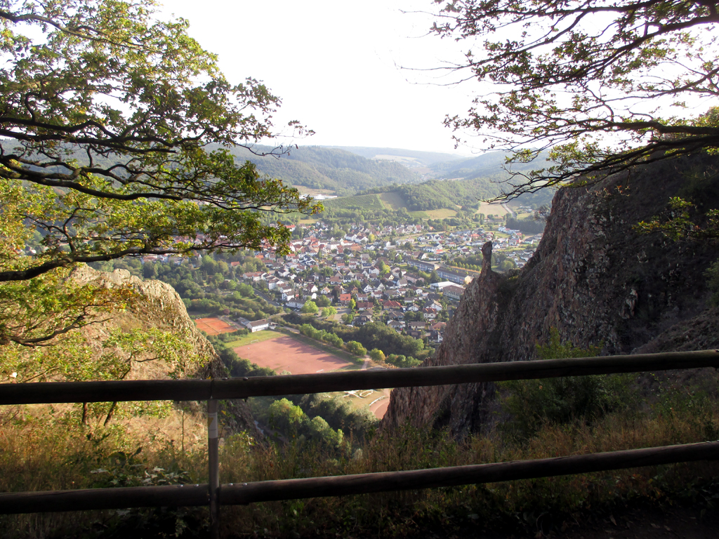 ... von dem aus viele Wanderwege abzweigen. Blick vom Rotenfels ins Tal der Nahe hinunter.
