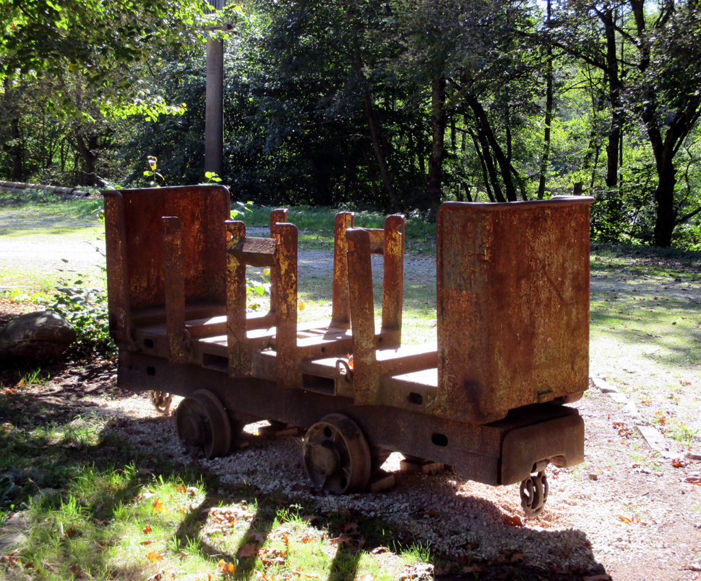 Alte Lore vor dem Kupferbergwerk Fischbach. Fachwerkhäuser und Wehrturm in Herrstein.