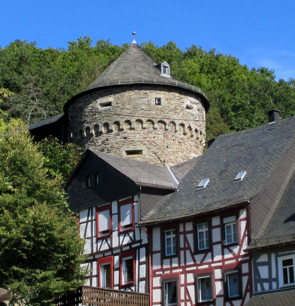 Wir haben noch etwas Zeit. Ein Abstecher führt uns die Deutsche Edelsteinstraße entlang und am Kupferbergwerk Fischbach vorbei ins mittelalterliche Herrstein. Rund 800 Einwohner. Wohl im 11. Jahrhundert gegründet. 1279 erstmals als Sitz des Ritters Ruither von Heresteyn urkundlich erwähnt. Später an die zwischen Nahe und Mosel mächtigen Grafen von Sponheim übergegangen. Stadtrechte 1428. Die Franzosen schleifen Stadtmauer und Wehrtürme. Herrstein wird Kanton und Teil der französischen Republik. Befreiungskriege. Wiener Kongress. 1817 zusammen mit dem Fürstentum Birkenfeld Eingliederung ins Großherzogtum Oldenburg. Herrstein wird preußisch. Die Fachwerkhäuser im Ortskern sind, so geht es aus einer Informationstafel an einer der mächtigen Mauern hervor, wohl zwischen 1600 und 1800 errichtet worden.