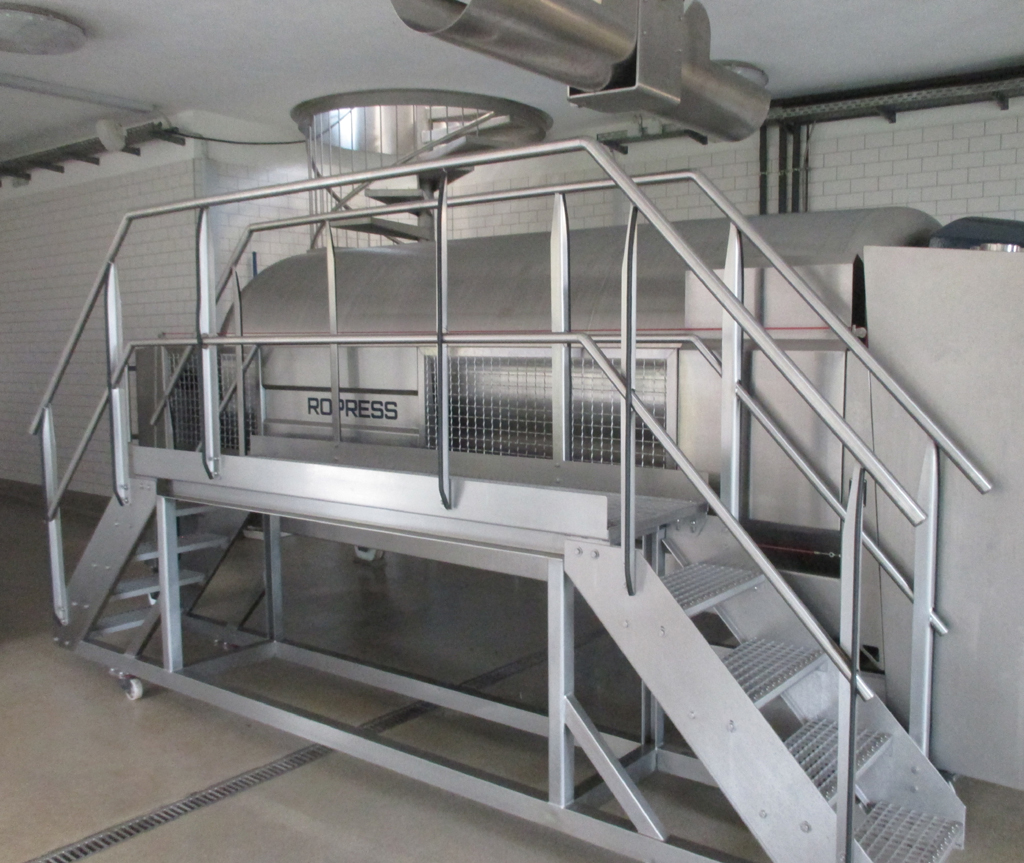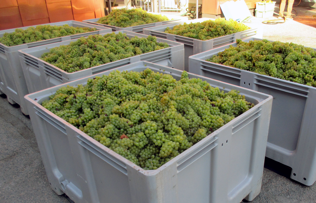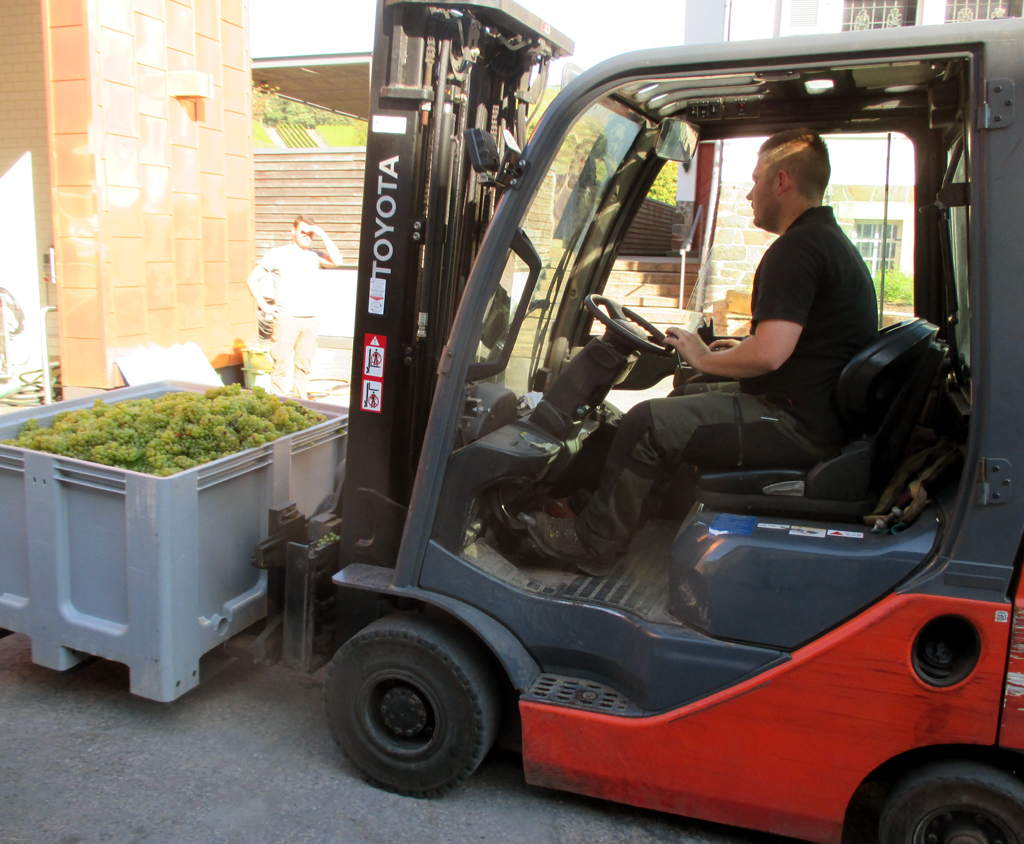 Per Gabelstapler gelangen die Trauben zur Sortiermaschine. Die Ausstattung ist modern.