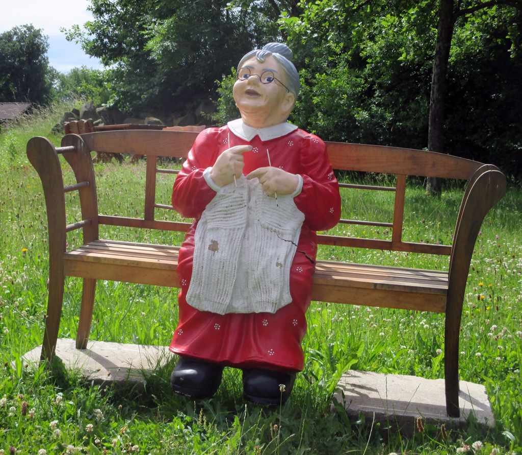 Zur blumigen Idylle in Harbshausen gehört die Oma auf der Bank, die strickt.