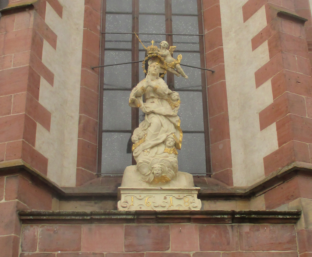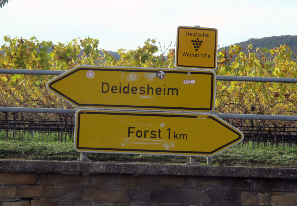 Links geht's nach Deidesheim, rechts nach Forst. Statue an der Kirche in Deidesheim.