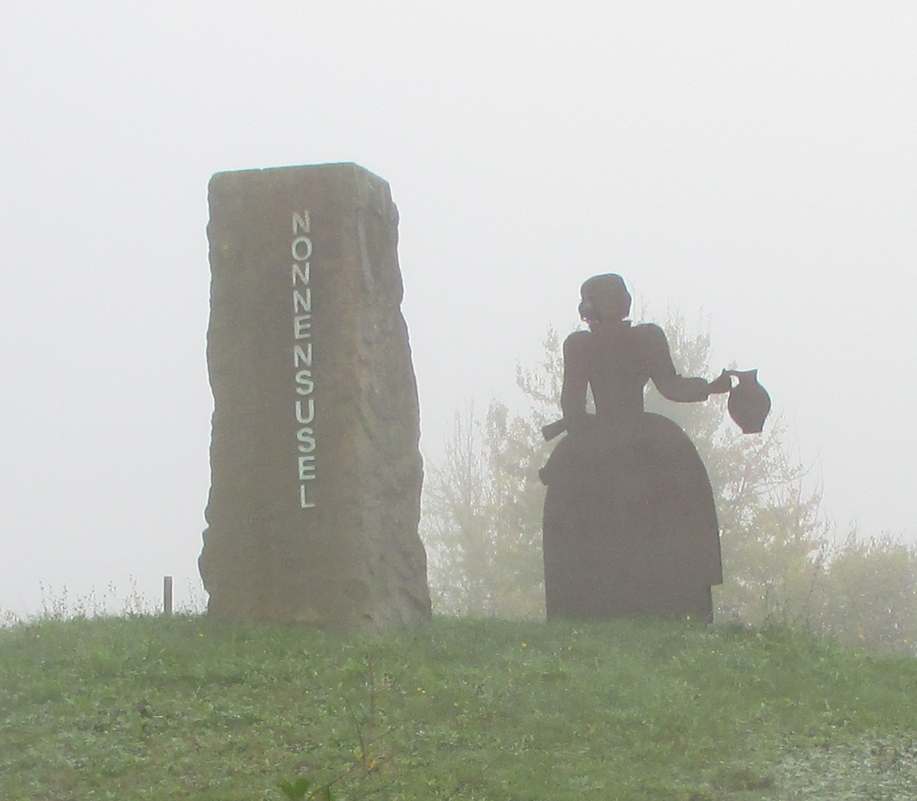 Im Nebel: Die Nonnensusel ist eine Wasgauer Romanfigur. Blick auf Pleisweiler-Oberhofen.