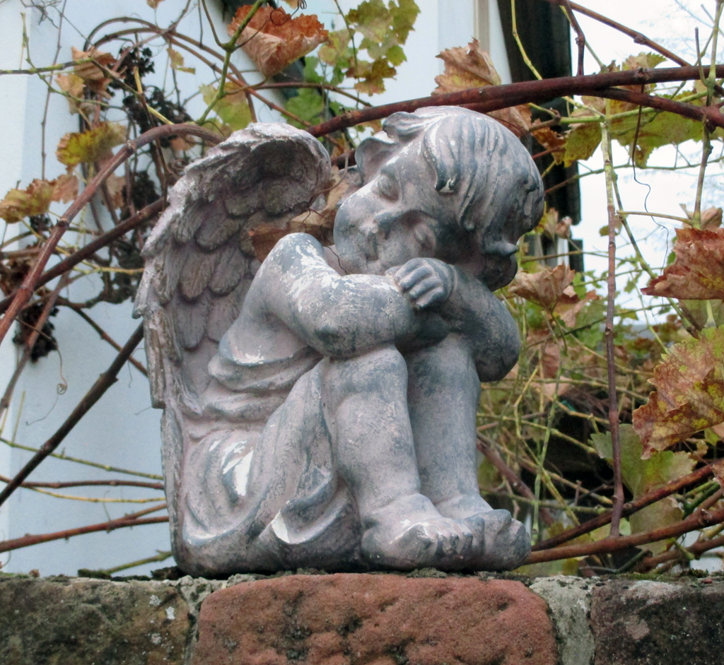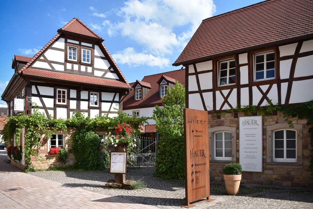 Das Fachwerk-Landhotel Hauer mit Engel auf der Mauer war früher ein bäuerliches Anwesen.