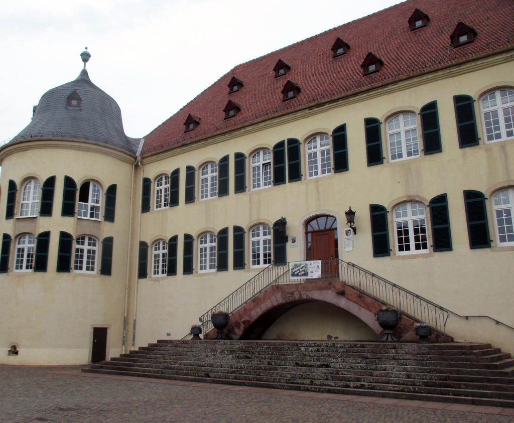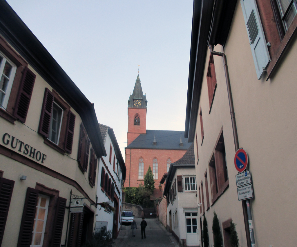 Die Landschaft im Bad Bergzaberner Land – der Name deutet es an – ist hügelig. Wir gehen am Schloss vorbei raus aus der Stadt, wandern auf dem Liebfrauenberg zum einst nach Bismarck benannten Aussichtsturm hinauf, einer 30 Meter hohen Holzkonstruktion mit 154 Stufen, von der aus man bei klarer Sicht weit über die südliche Pfalz hinaus in die Rheinebene sogar bis jenseits des Flusses hinüber nach Karlsruhe und Philippsburg und weiter rechts ins Elsass schauen kann. Das Wetter wird schlechter. Es fängt zu regnen an. Der November zeigt sich zumindest an diesem Nachmittag tatsächlich von seiner eher tristen Seite. Gut, dass am Abend in Oberhofen wenigstens die Weinstube Leonhard mit regionalen Gerichten wie Pfälzer Vesperbrett, Rieslingschinken mit Kraut und Sahnemeerrettich, Winzersteak und, natürlich, gebratenem Saumagen mit Sauerkraut sowie Flammkuchen geöffnet hat.