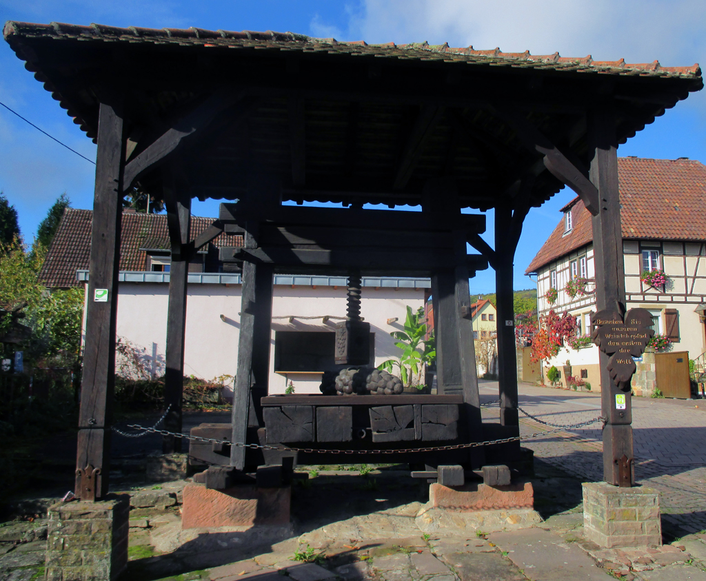 Alte Traubenpresse neben dem Deutschen Weintor und „Uffbasse!“-Souvenir in der Südpfalz.