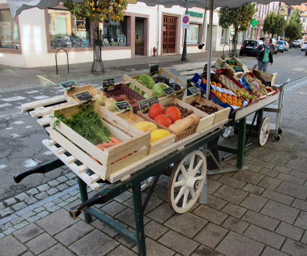 Fachwerkhäuser sowie Obst- und Gemüsewagen im elsässischen Wissembourg, deutsch Weißenburg.