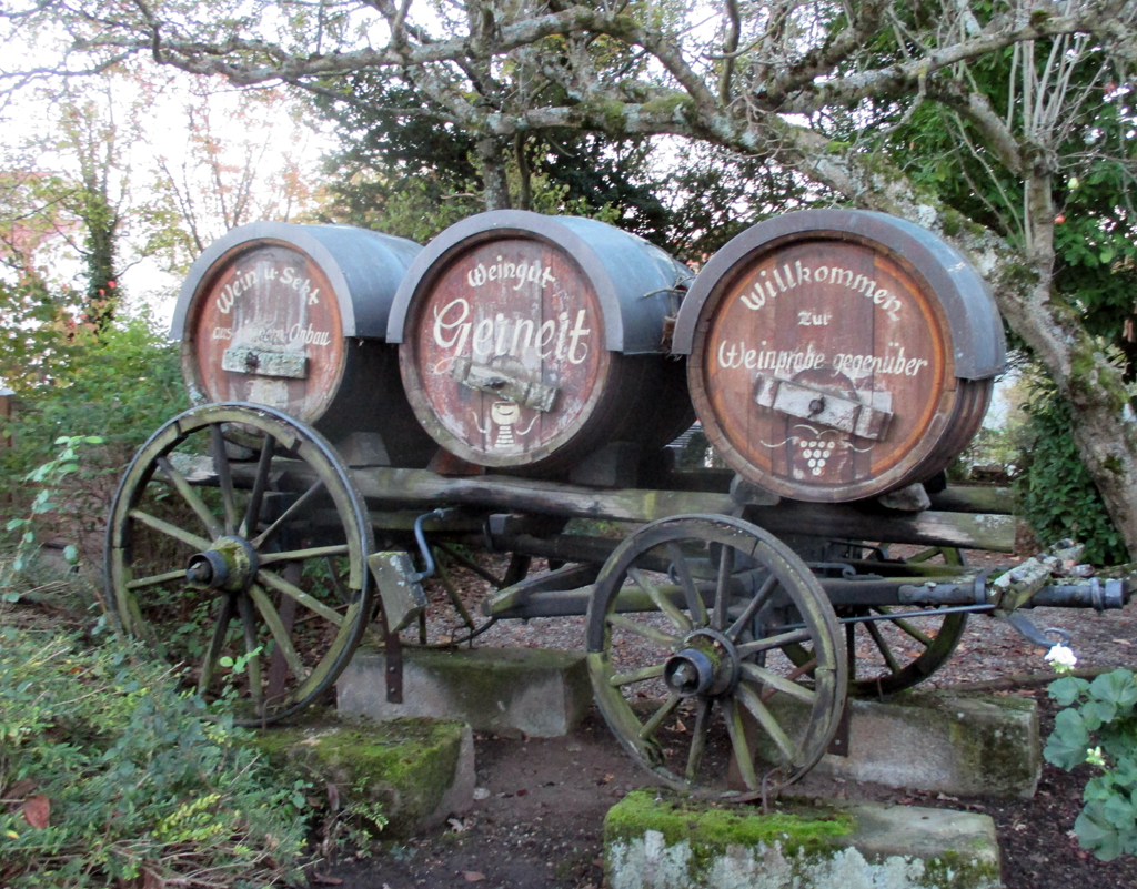 Wieder zurück in der Südpfalz mit Blick auf das Weindorf St. Martin. Alter Wagen mit Weinfässern.