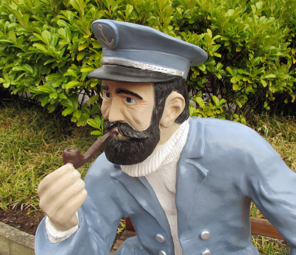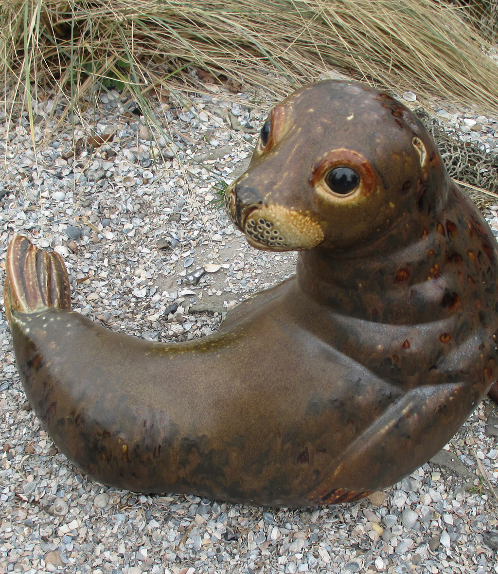 Seehund-Skulptur vor einem Lokal. Krabbenkutter an ihren Anlegern im Hafen.
