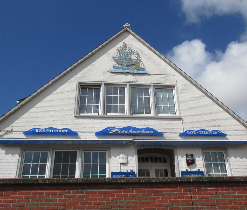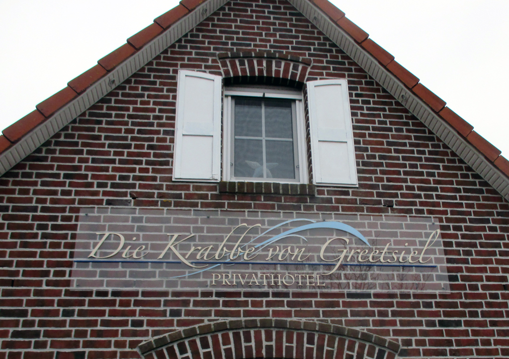 Unterwegs scheint eigentlich ziemlich beständig die Sonne. An der ostfriesischen Nordseeküste ziehen aber immer drohender dunkle Wolken auf, je näher wir dem unmittelbar an der Leybucht gelegenen Sielort kommen. Wir haben uns im kleinen Garni-Privathotel „Krabbe von Greetsiel“ in der Inselstraße 3 einquartiert. Da hat Inhaberin Elisabeth Stroman („Wir sprechen unsere Gäste noch mit Namen an und haben noch richtige Zimmerschlüssel“) auf der Seite, auf der sie im Internet ihre liebevoll-maritim eingerichtete Herberge beschreibt, schon einmal über den Gruß der Friesen aufgeklärt, mit dem man sich hier in der Tat allerorten begrüßt, und zwar unabhängig von der Tageszeit. Mit Moin!