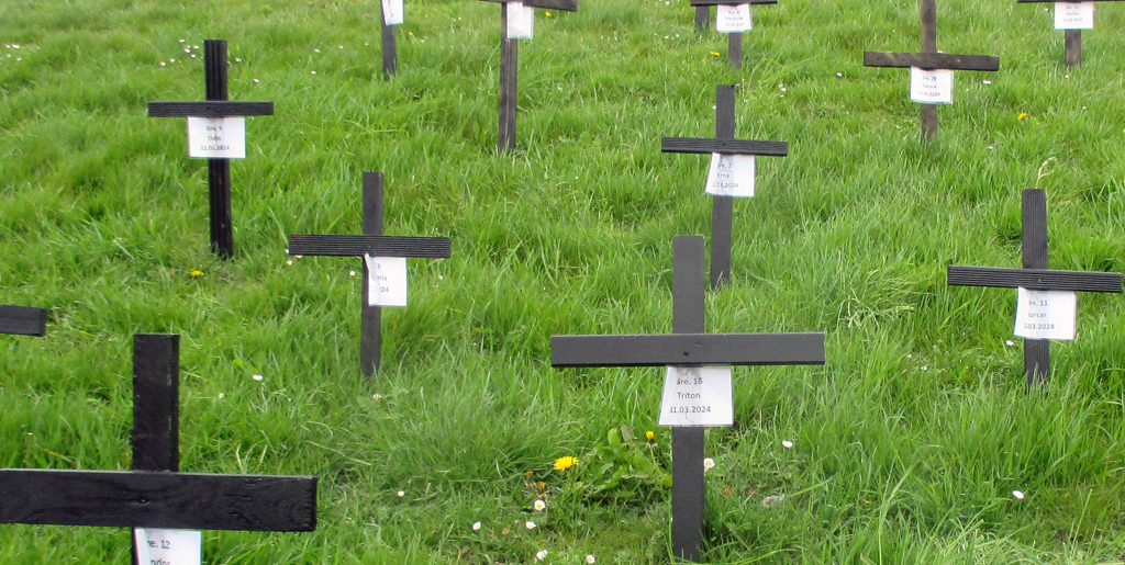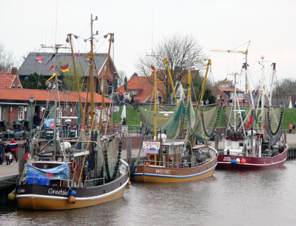 Mit über 20 Krabbenkuttern soll in Greetsiel zuletzt immerhin noch Ostfrieslands größte Kutterflotte zu Hause gewesen sein. Der Hauptfang besteht aus Nordseekrabben, auch Granat genannt. Daneben gehen in kleineren Mengen Plattfische wie Scholle, Scharbe und Seezungen ins Netz. Alles eigentlich soweit in Ordnung. Und doch scheint die ostfriesisch- seeromantische Idylle im Moment gar nicht so idyllisch zu sein. Denn: „Es reicht“, steht auf einem Plakat im Hafen mit gleich drei Ausrufezeichen dahinter und rotem Stopp-Schild im meerblauen Wasser darunter. Die verbliebenen Fischer warnen: „Die EU & Umweltorganisationen sorgen für unseren Untergang!“ und „Die Nordsee wird zum Industriepark!“ Sie fordern: „Nachhaltige, traditionelle und zertifizierte Fischerei für Mensch & Natur erhalten! Keine Fischereiverbotszonen in der Nordsee!“ Nicht weit davon entfernt, nur ein paar Schritte am Deich etwas oberhalb der Schiffsanleger, schon eine ganze Reihe von Holzkreuzen. „Im Gedenken an die Krabben- und Muschelfischer aus Greetsiel.“