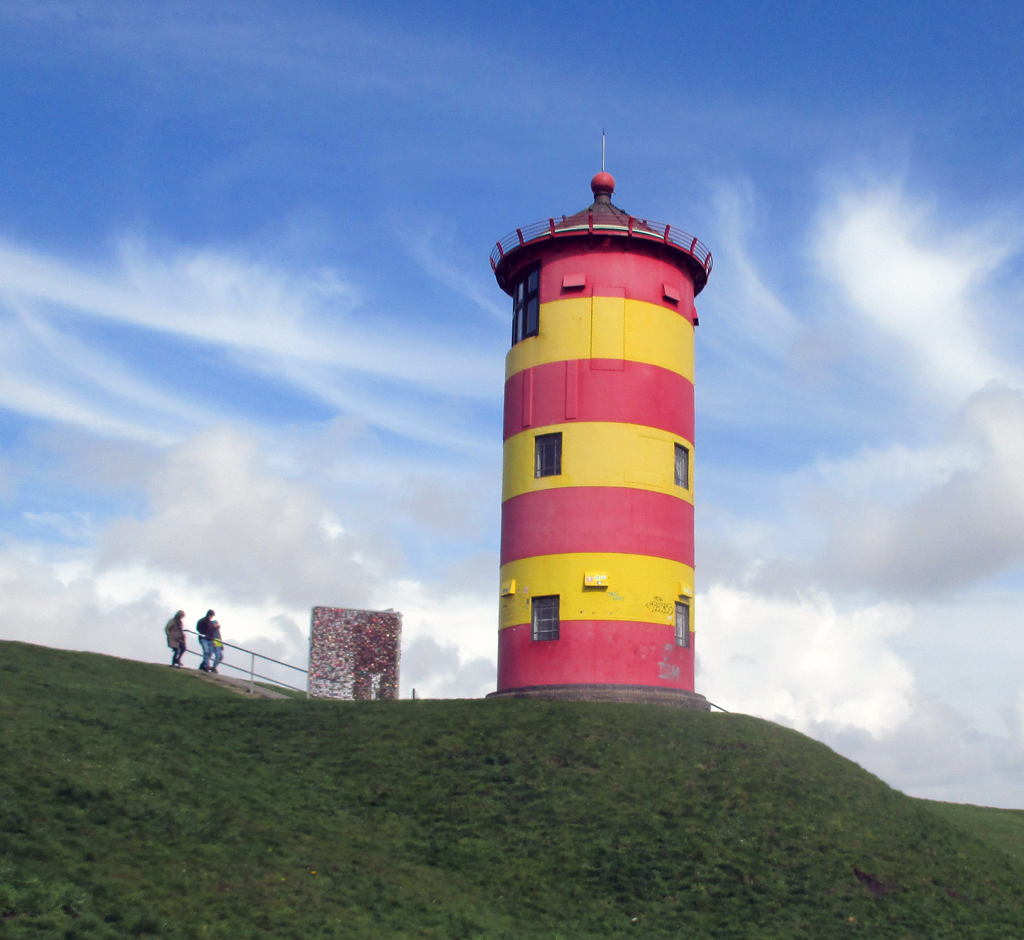 Der Himmel über Greetsiel klart ohne größeren Regenguss überraschend schnell wieder auf. Die Bedienung im Teestübchen Dat Huuske direkt am Hafen sagt, so sei das „hier oben an der Küste, eben noch dunkle Wolken, kurz danach schon wieder Sonnenschein“. Wir müssen uns noch daran gewöhnen – und uns tags darauf auf der Deichwanderung hinüber zum Pilsumer Leuchtturm, einem der Wahrzeichen der Region, regelrecht gegen Regen, Wind und sogar Hagel stemmen, während unten im Marschland ein Deicharbeiter einsam Holzpfähle einschlägt. Der Turm ist gegen Ende des 19. Jahrhunderts fertiggestellt worden. 28 Stufen führen zu ihm auf den Damm hinauf, von dem aus man gegenüber im Dunst die niederländische Küste erkennt. Der Turm selbst, ein Wahrzeichen mit gelb-roter Ringelsöckchen-Lackierung, in dem man sich auch trauen lassen kann, misst elf Meter Höhe. So richtig bekannt gemacht haben soll ihn laut Verwaltung der Ferienregion Krummhörn-Greetsiel aber der „wahrscheinlich bekannteste Ostfriese“, Otto Waalkes, der in der filmischen Komödie „Otto – Der Außerirdische“ aus dem Jahr 1989 als Hauptdarsteller in dem Turm gewohnt hat.