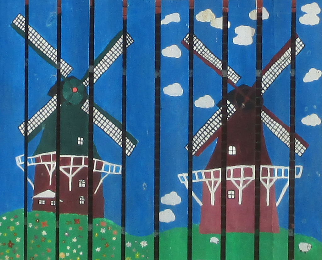 Die Zwillingsmühlen auf Zaunlatten aufgemalt. Und wie wär’s jetzt mit einem Tee?