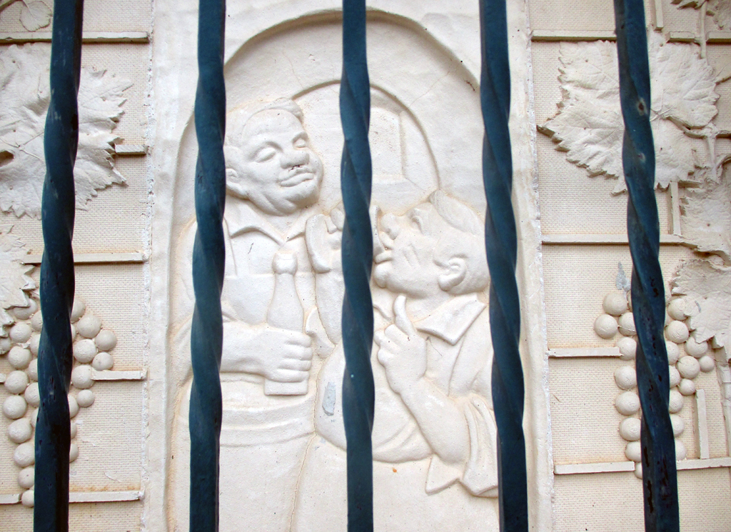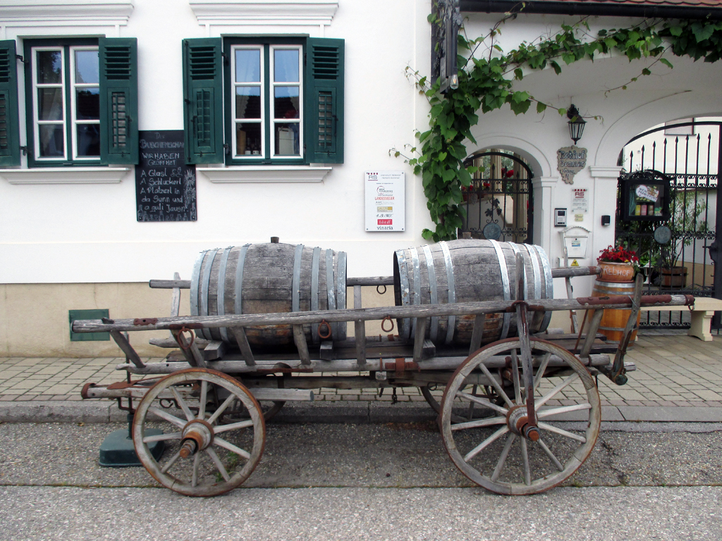 Alter Leiterwagen mit Fässern drauf. Selbst hinter dem Gitter geht’s um Wein.