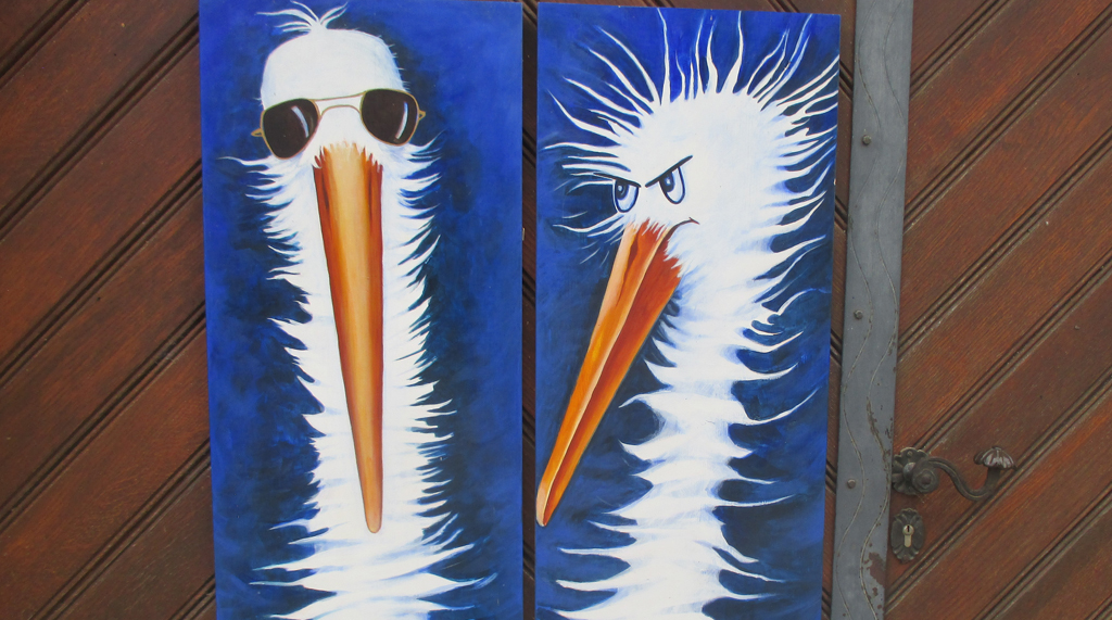 Störche in Rust – auf einem Dach neben dem anderen, als Karikatur und ...