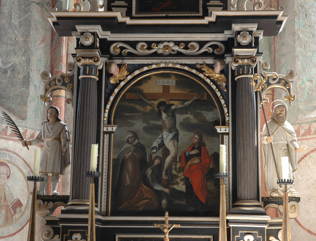 … samt prächtigem Altar. Ein buntes Bild als Werbung für Wein aus der Freistadt.