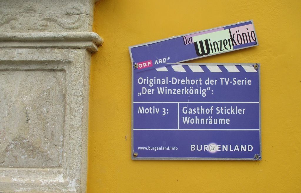 Bei einem Rundgang durch Rust fallen einem an verschiedenen Orten gelegentlich diese Klappen auf, wie man sie von Kino- oder Fernsehfilmdrehs her kennt. Auf einer, hinter Blätterwerk im Innenhof der Akademie an einer Mauer, steht „Motiv 6“. Und daneben „Stadtvinothek“. Ganz oben die Logos vom Österreichischen Fernsehen ORF und der deutschen ARD. Darunter ist „Original-Drehort“ zu lesen. Drehort für den in 39 Episoden in drei Staffeln erstmals 2006 ausgestrahlten „Winzerkönig“, der Einblicke ins Alltagsleben von Weinbauern gegeben und aus Sicht des Burgenland-Tourismus die „schönsten Seiten von Rust und der Region Neusiedler See/Seewinkel“ gezeigt hat. Klar, dass Waltraud Kummer es gegenüber Rust-Besuchern schon früher damit gehalten hat: „Sie sehen, wir lieben natürlich ebenfalls den Wein!“ Und wohl auch, dass am Ende über den Köpfen der Ruster eher Störche und keine Geier kreisen ...