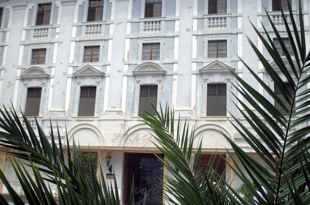 Wandtapete mit asiatischen Motiven. Hier rechts fanden sich früher die Stallungen.