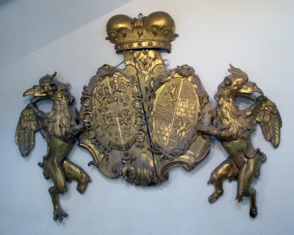 Im Innenhof von Schloss Esterházy und Wappen im Treppenaufgang.