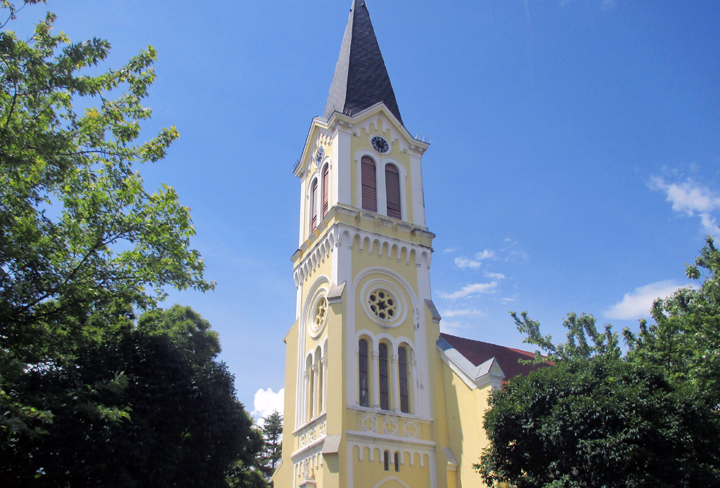 Außerhalb der Städte ist Ungarn ländlich geprägt. Kirche in Harka, früher Harkau.