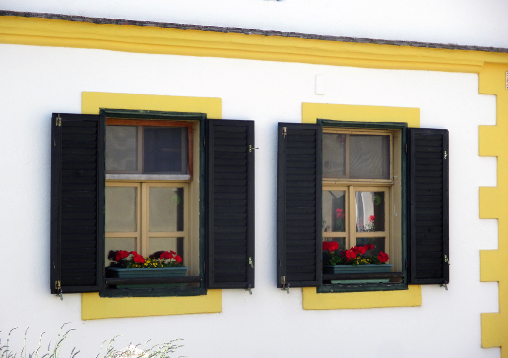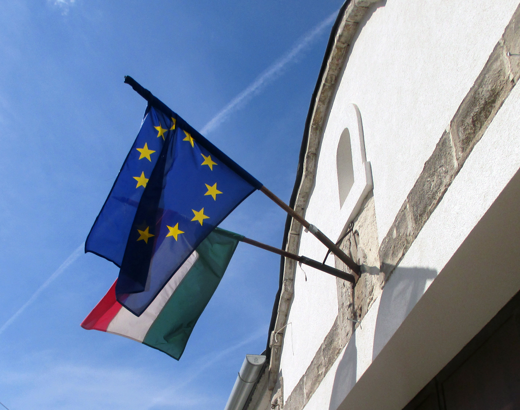 Europa- und Ungarn-Flagge in Fertörákos. Die Häuschen in der Region sind bisweilen hübsch anzusehen.