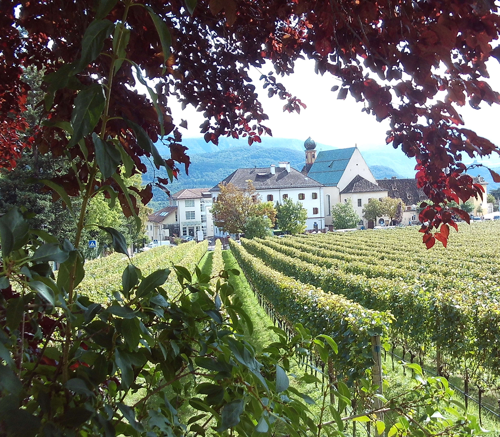In Kaltern: Der Weinberg vorn, der Busbahnhof dahinter, dann das dörfliche Zentrum. Foto: Koch