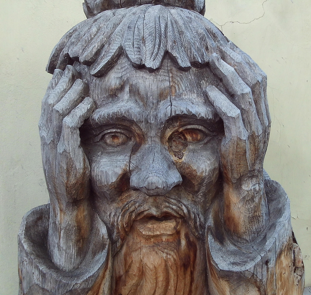 Auf dem Marktplatz von Kaltern. Holzschnitzerei-Figur: Schon wieder diese Touristen!