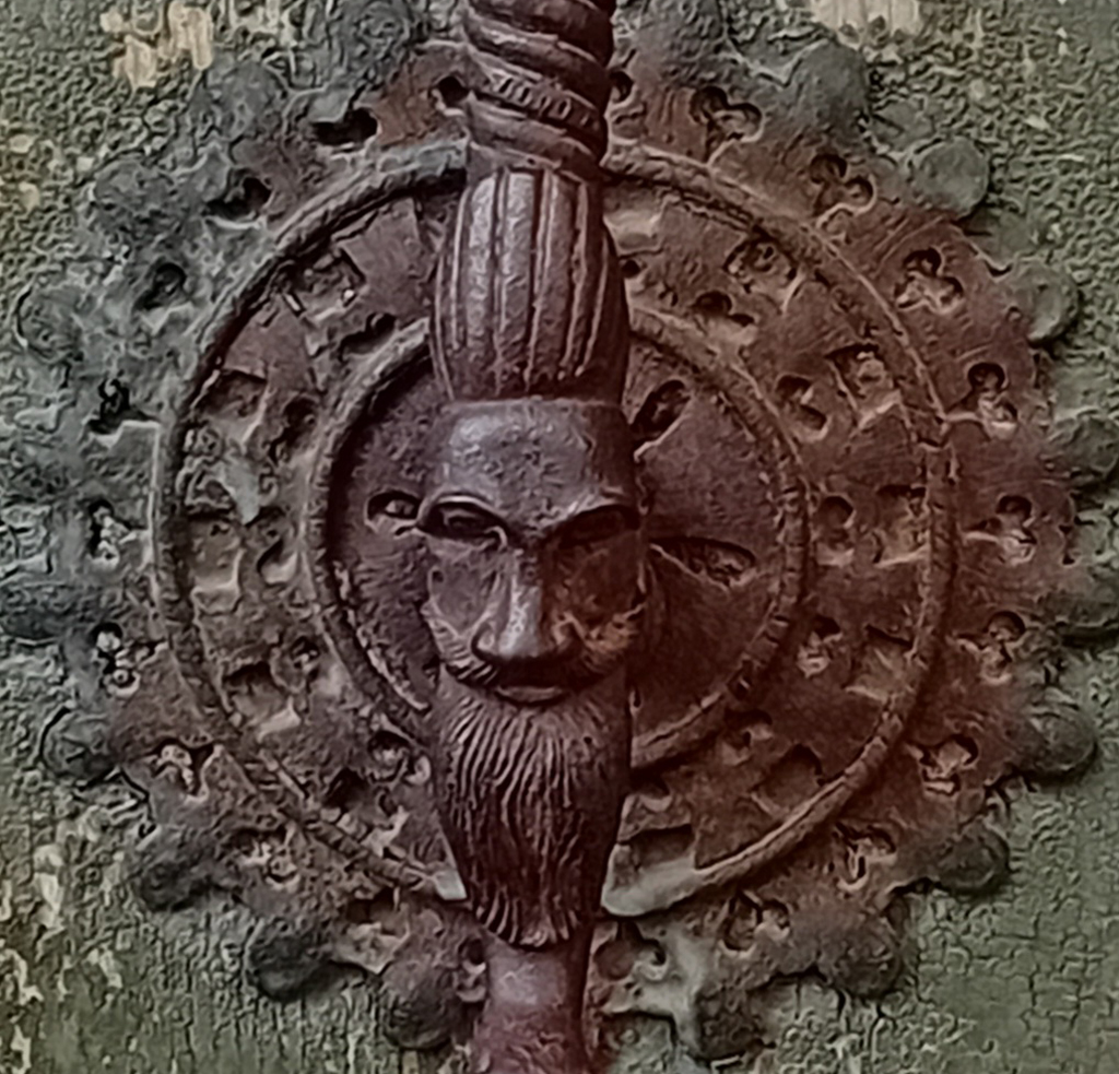 Blick aufs Hügelland der südlichen Talseite der Etsch. Geschmiedete Türgriff-Skulptur.