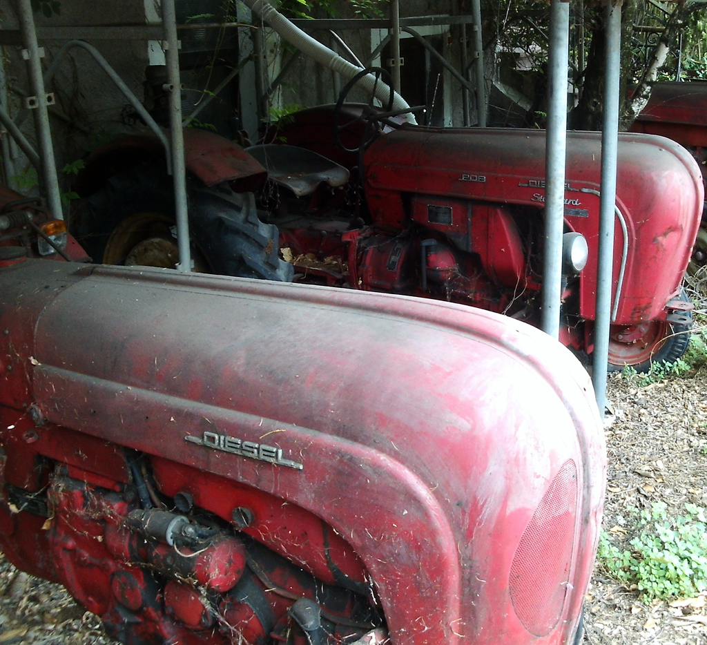 Alte Traktoren am Kalterer See. Blumengeschmückte Andachtsstelle im Ort.