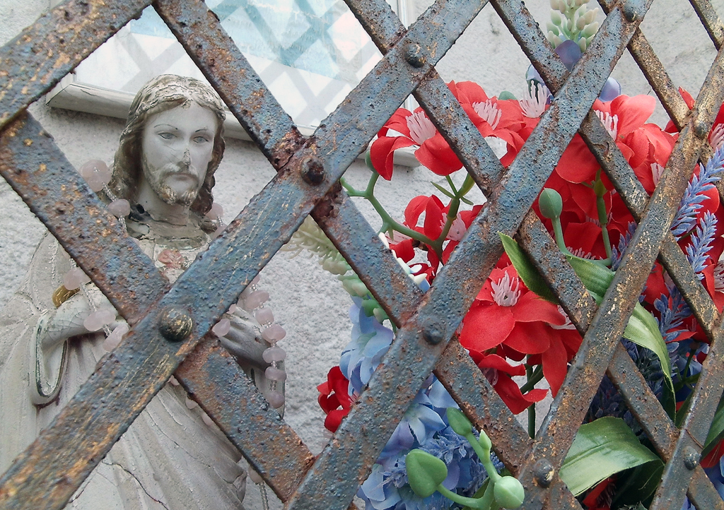 Christliches Steinrelief neben einer Palme. Mit gemauerten Eingangsbogen haben es die Südtiroler.