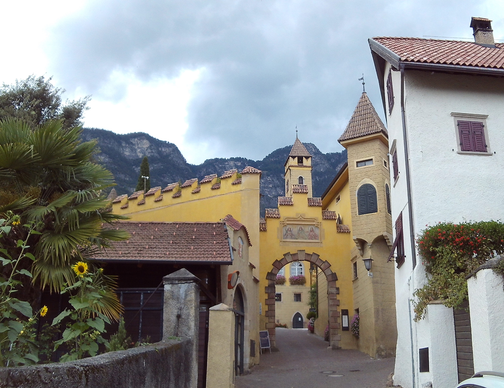 Auf dem Dorfplatz von Tramin. Der Baustil ist typisch für die gesamte Region.
