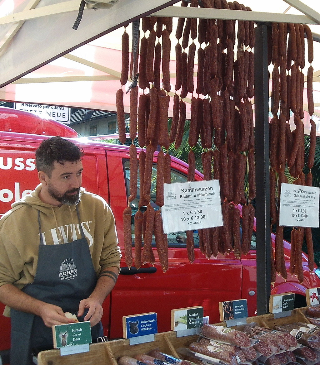 An diesem Stand gibt es auch Südtiroler Kaminwurzen-Salami zu kaufen. Karte der Kalterer Region.