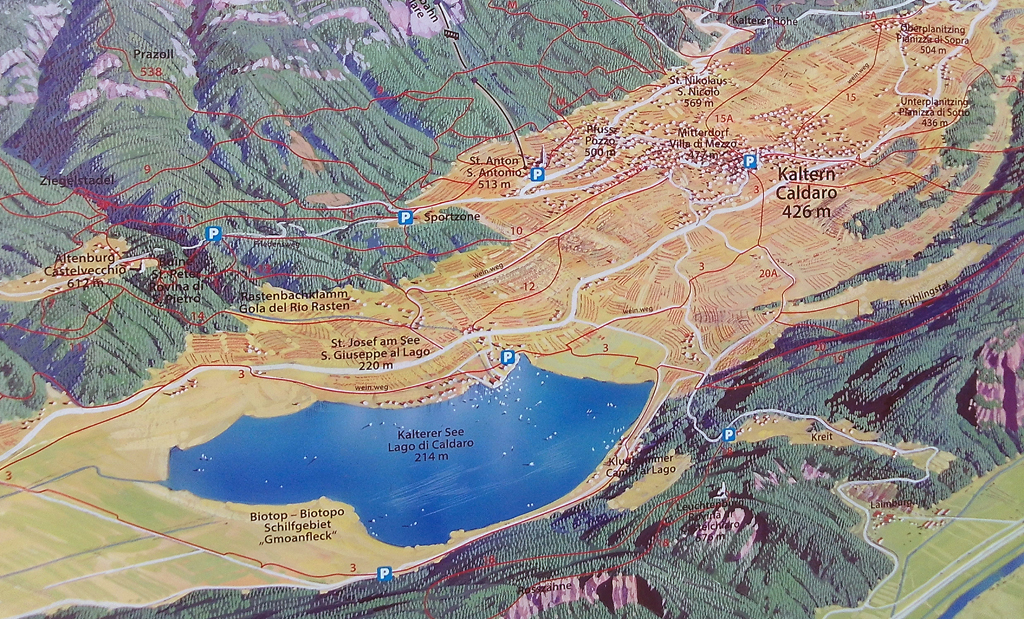 Kaltern, 8000 Einwohner, italienisch Caldaro, hat einen gemütlichen Marktplatz, zeichnet sich immer wieder durch den Überetscher Baustil aus mit Zinnen und Erkern, gerahmten Türstöcken und Fensterbögen, Zwillingsfenstern mit Mittelsäulen, dazu Arkaden, Loggien, Freitreppen und Innenhöfen. Von insgesamt 14 (!) Kirchen ist die Rede. Bei der größten, der von Maria Himmelfahrt, steht der Turm getrennt vom Hauptgebäude. Schloss Sallegg im Ortsteil Mitterdorf ist einst ein kleinerer Wohn- oder Rittersitz des niederen Adels gewesen. Was aus einem Gefängnis alles werden kann, zeigt sich in der Galerie Le Carceri bei Ausstellungen zeitgenössischer Kunst. Im Weinmuseum dreht sich natürlich alles, zumal an der Weinstraße, um Wein. Die 1903 eröffnete Standseilbahn mit dem schönen italienischen Namen Funicolare della Mendola führt vom Ortsteil Sankt Anton-Pfuß zum Hausberg Mendel hinauf: Starthöhe 510 Meter, Bergstation 1364 Meter, Streckenlänge 2370 Meter, Fahrzeit 12 Minuten, Höhenunterschied 854 Meter, Steigung im Schnitt 39, maximal 64 Prozent.