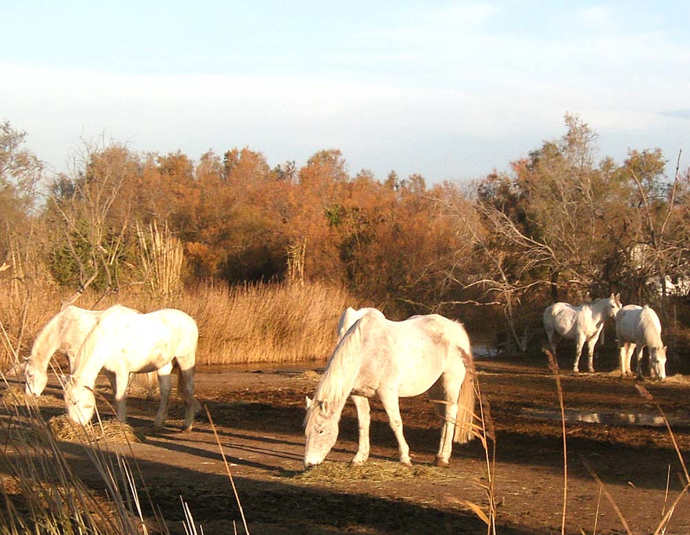 Die dünn besiedelte Camargue im Westen der Provence im Süden Frankreichs besteht aus dem gut 900 Quadratkilometer großen Delta zwischen beiden Mündungsarmen der Rhône und der Mittelmeer-Küste. Sie stellt eine außergewöhnliche Sumpf- und Seenlandschaft dar. Das Klima ist mediterran. Im Spätsommer drohen in bestimmten Gebieten Mücken-Plagen. Beste Reisezeiten sind Frühjahr und Herbst. Wir waren im Auberge Cavaliere (vier Sterne, 83 Zimmer, originelle Cabanne-Häuschen, von Wasser umgeben, www.aubergecavaliere.com) am Ortsausgang von Les-Saintes-Maries-de-la-Mer untergebracht.