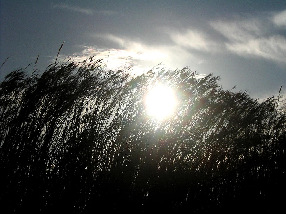 Schilfgras neigt sich, vom Mistral gebeugt, in der Sonne, der Wind fegt