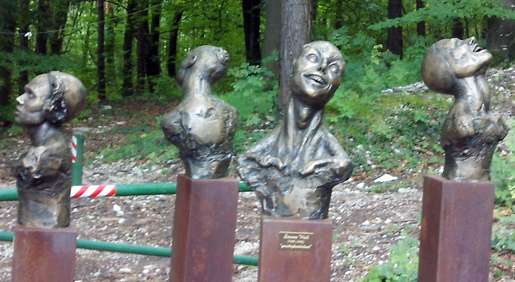 Die Wanderwege sind gut beschildert. Vier bronzene Frauenbüsten mitten im Wald.