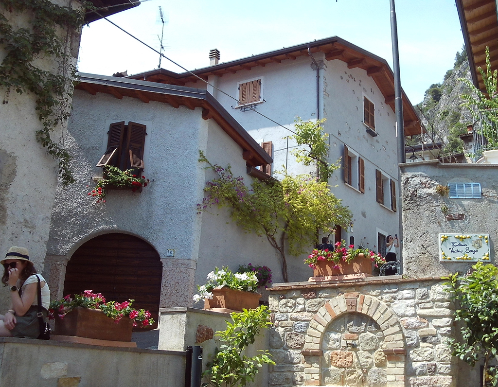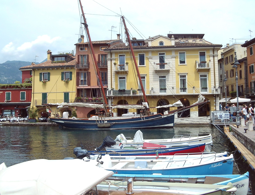 Wir setzen über. Mit dem Boot von Limones kleinem Hafen Porto Nuovo schräg gegenüber nach Malcesine zu Füßen des Monte Baldo am östlichen Ufer des Sees. Wie Limone ist Malcesine stark vom Tourismus geprägt. Den gleich von zwei Gardasee-Winden umwehten 3500-Seelen-Ort mögen vor allem Wind-, Kitesurfer und Segler wegen seiner nördlichen Lage. Eine Seilbahn führt ins Monte-Baldo-Massiv. Wanderer, insbesondere aber auch Mountainbiker nutzen sie, um später über Schotterpisten dann wieder hinunter ins Tal zu fahren. Ebenfalls als Startplatz für Gleitschirmflieger ist der leicht erreichbare, zum Landeplatz in Malcesine eine enorme Höhendifferenz aufweisende Berg beliebt. Im Ort selbst lohnt der Kapitänspalast Palazzo dei Capitani einen Besuch, dazu die barocke Pfarrkirche Santo Stefano und die mit Namen Santi Benigno e Caro. Imposantes Wahrzeichen aber ist die mächtige, schon weithin sichtbare Scaligerburg auf einem Felsvorsprung direkt am Ufer des Sees. Sollten Sie übrigens bei Pedro in der Vicolo Porto Vecchio 9 einkehren und sich in der engen Gasse für Pizza, Pasta oder Fisch unmittelbar am Wasser entscheiden: Achtung! Die Wellen am See könnten, verursacht durch die Ausflugsboote, direkt an ihre Füße schwappen und ihren Platz unter Wasser setzen …