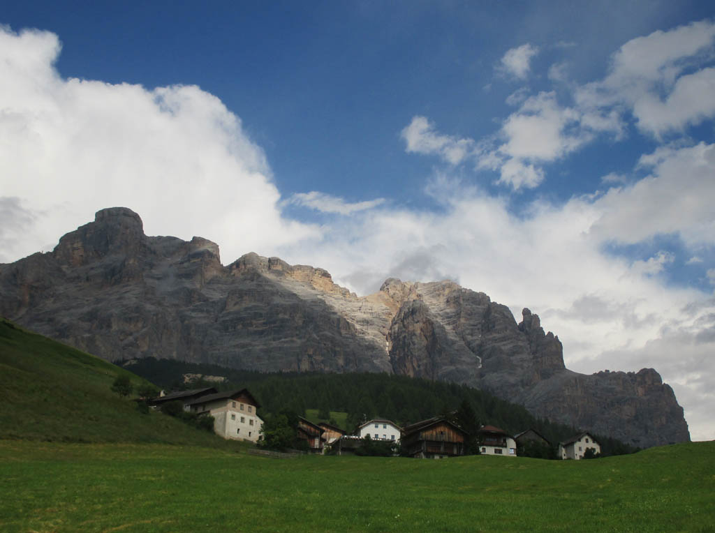 Dolomiten-Sommer: Grüne Wiesen, schneefreie Berge, darüber Wolken und blauer Himmel. Foto: Koch