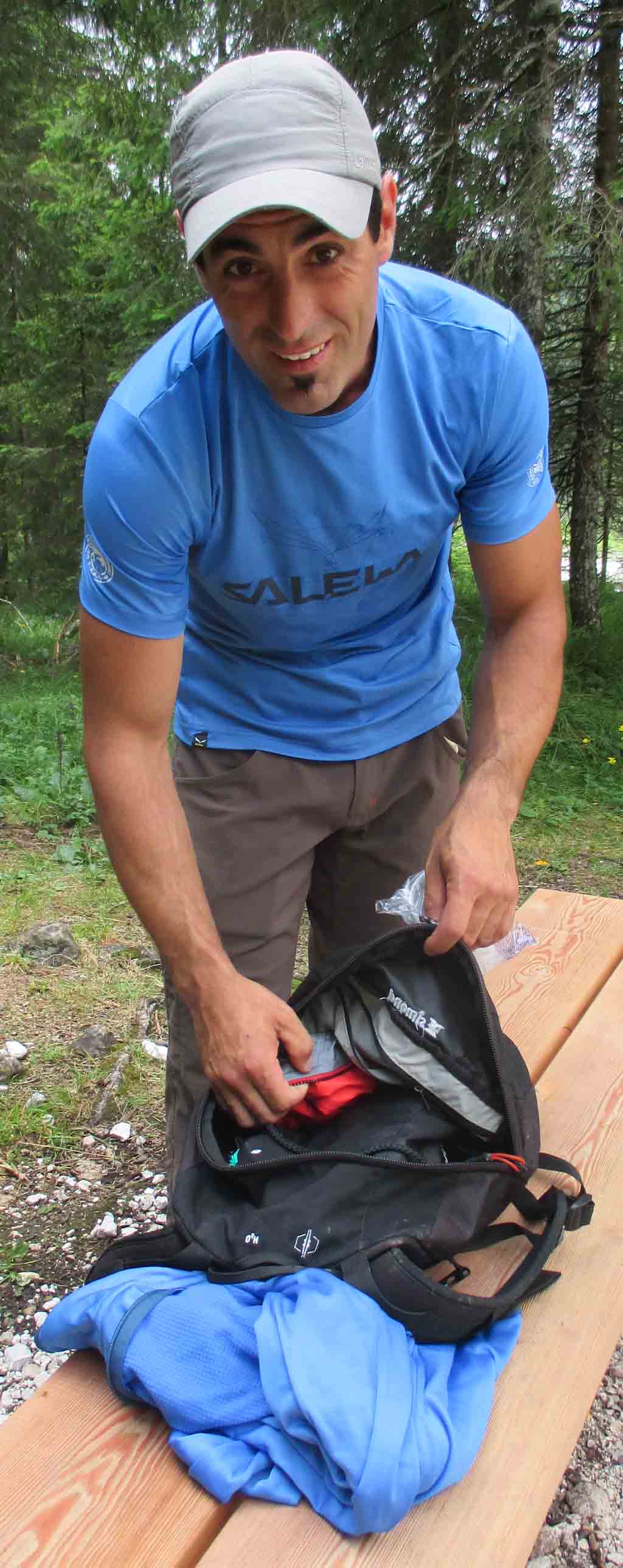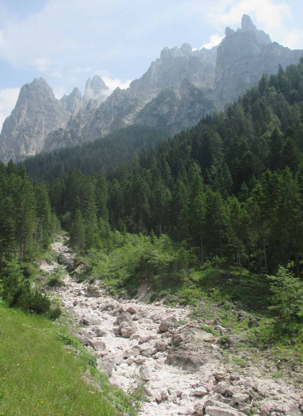 Andiamo! Cristiano drängt zum Aufbruch. Im Rucksack führt er eine Flasche Mineralwasser, Becher für jeden, Trockenobst, eine kleine Leuchte und ein Funkgerät „für alle Fälle“, dazu für sich selber ein atmungsaktives Shirt zum Wechseln und eine leichte Regenjacke mit. Die Sonne scheint. Es ist Mittagszeit und ziemlich warm an diesem Tag Mitte Juli, fast sogar schon schwül. „In den Bergen“, mahnt der wander- und gipfelerprobte Trentiner. „kann sich das Wetter sehr schnell ändern.“ Auch die, die mit forschem Schritt loslegen, fängt er gleich wieder ein, rät, es lieber langsamer angehen zu lassen, weil er weiß, dass diese Tour doch etwas anspruchsvoller ist. Rechts breitet sich in einem im Sommer komplett ausgetrockneten Flussbett eine Steinwüste aus. Schroffe Felswände ragen links und vor uns in die Höhe. Cristiano bleibt kurz stehen, deutet auf eine Felsformation, fragt, was wir glauben, woraus die wohl besteht.