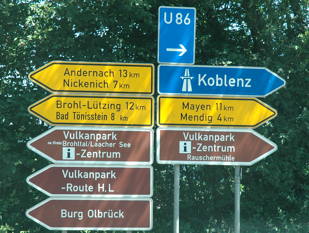 Wir sind auf der Deutschen Vulkanstraße unterwegs. Die 280 Kilometer lange Touristikroute verläuft vom Rhein bis in die Hohe Eifel, verbindet vom Laacher See über Orte wie Kruft, Mendig, Daun und Manderscheid sowie über verschiedene Maare vom Ulmener bis hin zum Meerfelder Maar fast 40 unterschiedliche Standorte des Geoparks Vulkanland Eifel in der Vulkaneifel. Bergwerke gehören genauso dazu wie Felswände, Grubenfelder, Gleit- und Gesteinsfalten, Höhlen, Steinbrüche, Weiher, Thermalquellen, Halden sowie Museen und Informationszentren.